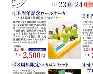 ①うちが毎年お世話になっている農家さんの中から長野県やまさ農園の関さんの幻の西洋梨と岩手県松原農園の吉田さんの台風5号を乗り越えたシャインマスカットを贅沢に使い、北海道根釧生クリームたっぷりのロールケーキに仕上げました。8周年の特別価格で販売します