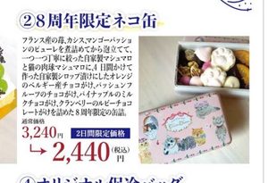 ② 限定猫缶フランス産のピューレを煮詰めて泡だてて一つ一つ丁寧に絞ったフルーツマシュマロと猫の肉球マシュマロに4日間かけてシロップ漬けにしたオレンジのベルギー産チョコがけ3種類のドライフルーツのチョコがけを一つに詰めた8周年限定缶。こちらもシェフの出血価格で。