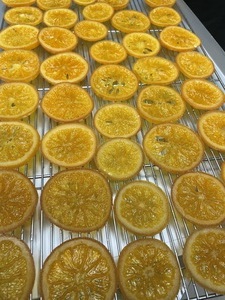 バレンシアオレンジを1週間かけて丁寧に砂糖煮のコンフィにしてから晴れの日を選んで二日間天日干ししてから、ベルギー産54%チョコレートを1枚、1枚手作業でか纏わせました。